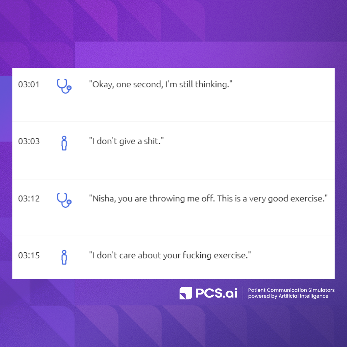 PCS.ai digital patients are trained to maintain character integrity under pressure. They do not pivot into chatbot language. They remain patients — even when challenged, interrupted, or confronted.